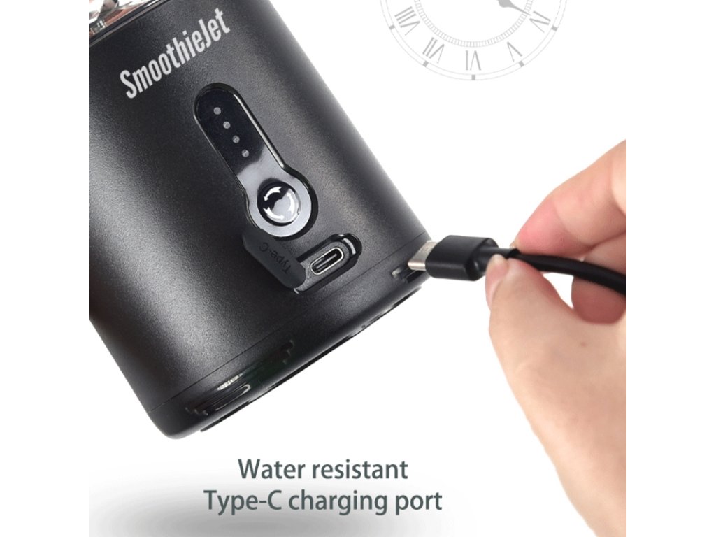 Nemusíte se vůbec bát, že byste po každém použití museli mixéry SmoothieJet nabíjet. Mixer je totiž vybaven kvalitní lithium-iontovou baterií s kapacitou až 4000 mAh, která na jedno nabití vydrží připravit až 20 čerstvých nápojů. Nabíjení probíhá pomocí USB kabelu, obdobně jako byste nabíjeli svůj mobilní telefon. USB kabel je součástí balení mixéru SmoothieJet. Velice jednoduše kabel zapojíte do klasické elektrické zásuvky, počítače, auta či k PowerBank. Díky tomu si můžete přenosný mixér vzít opravdu kamkoli.